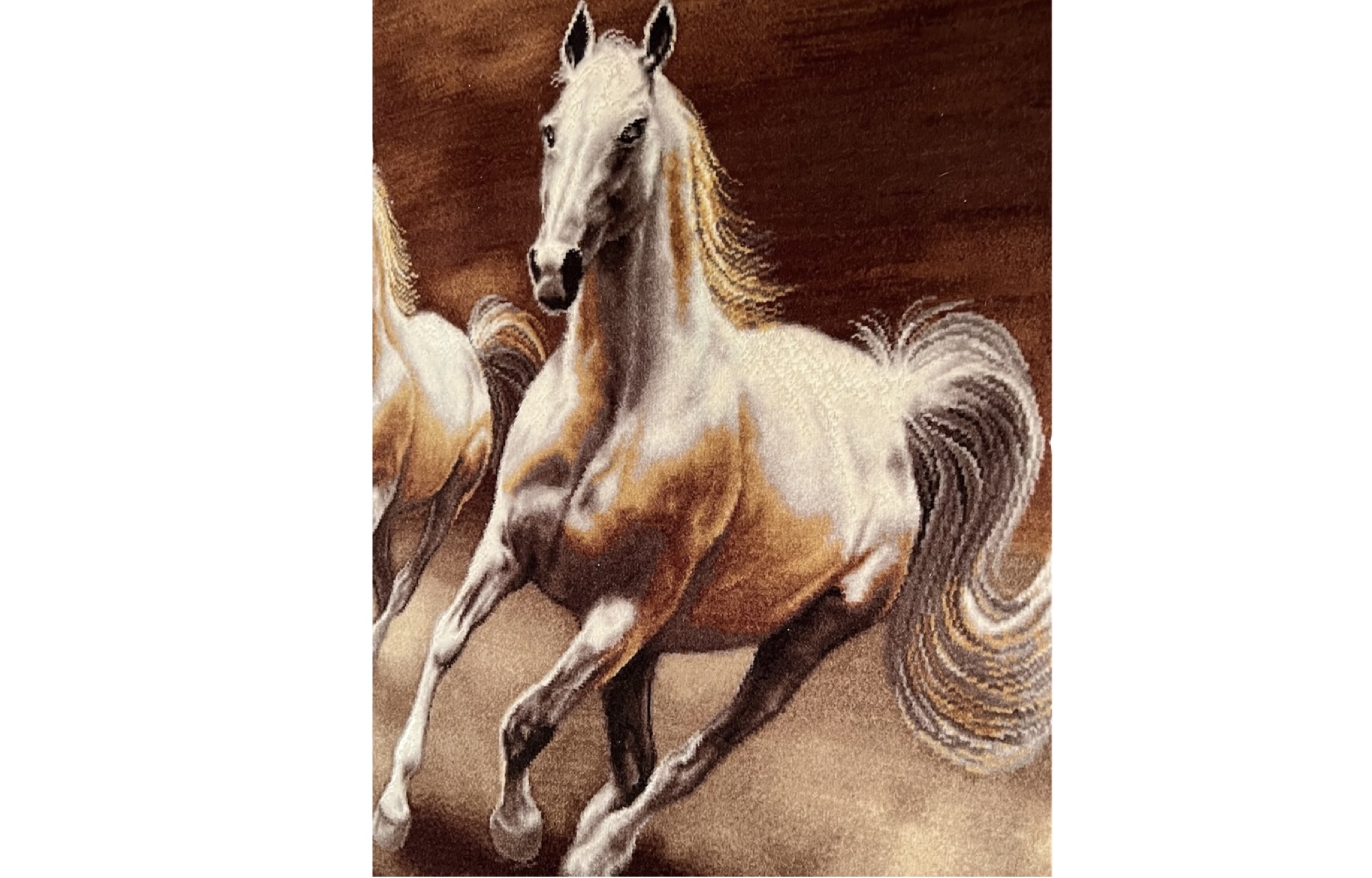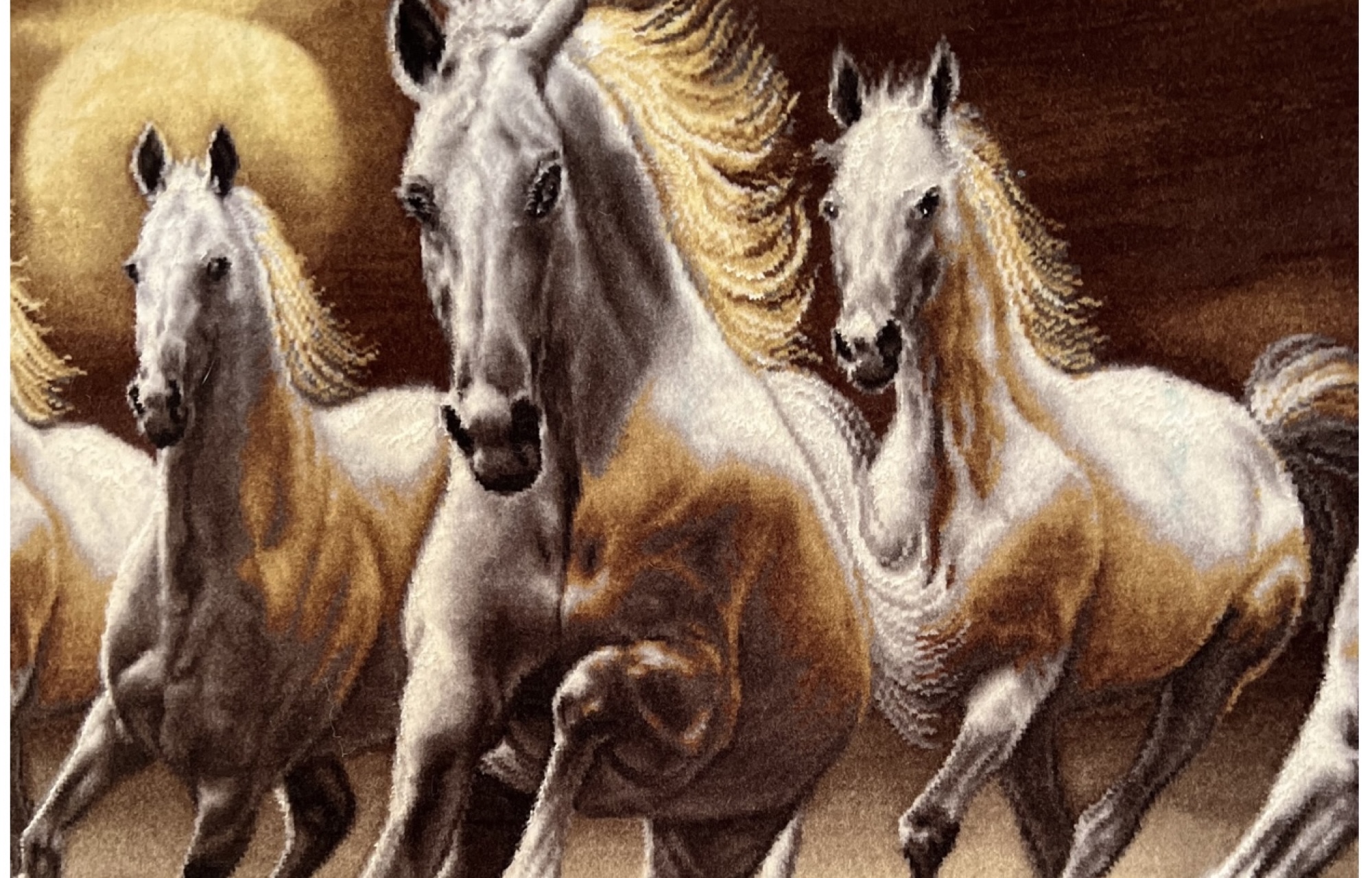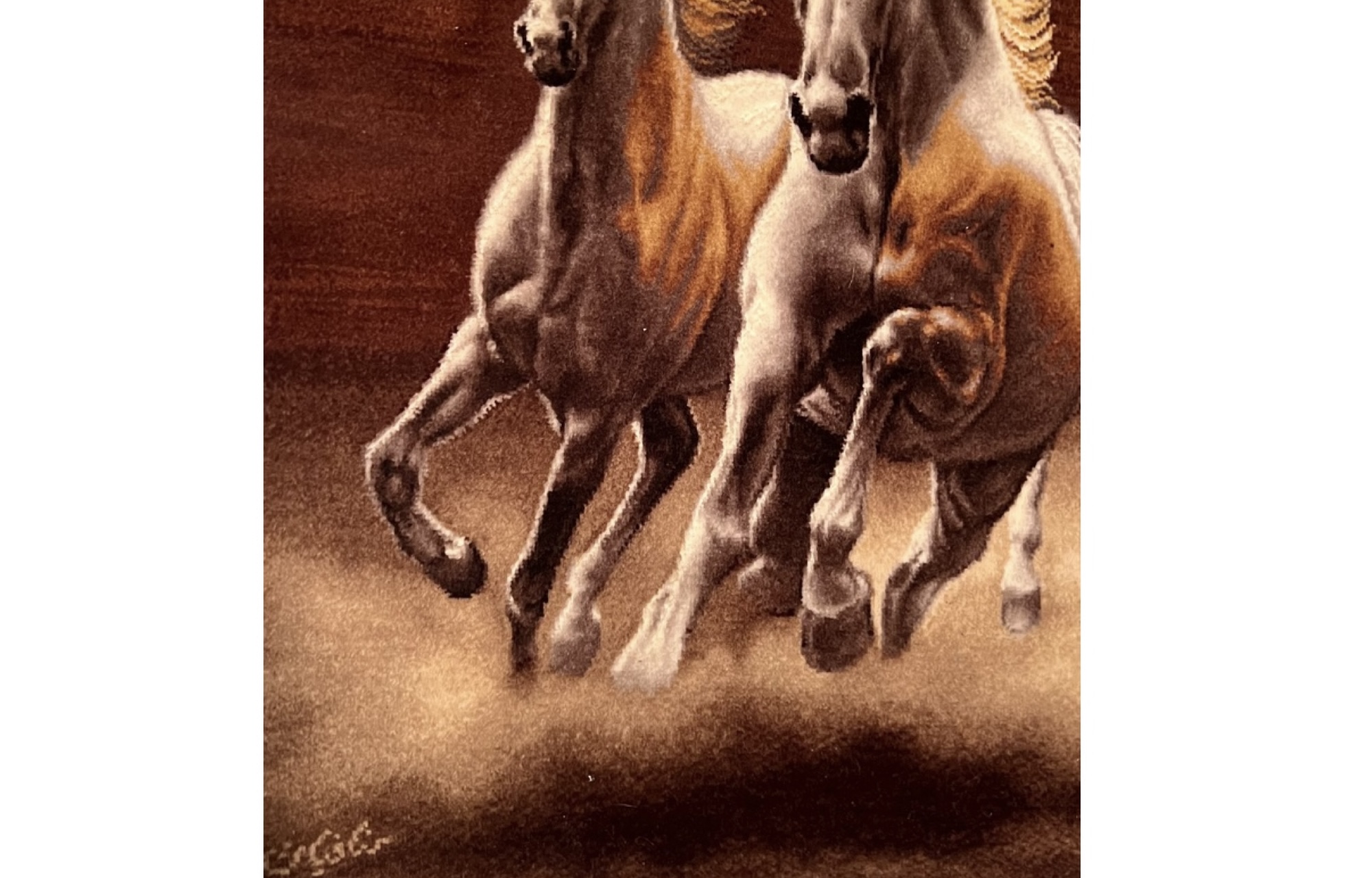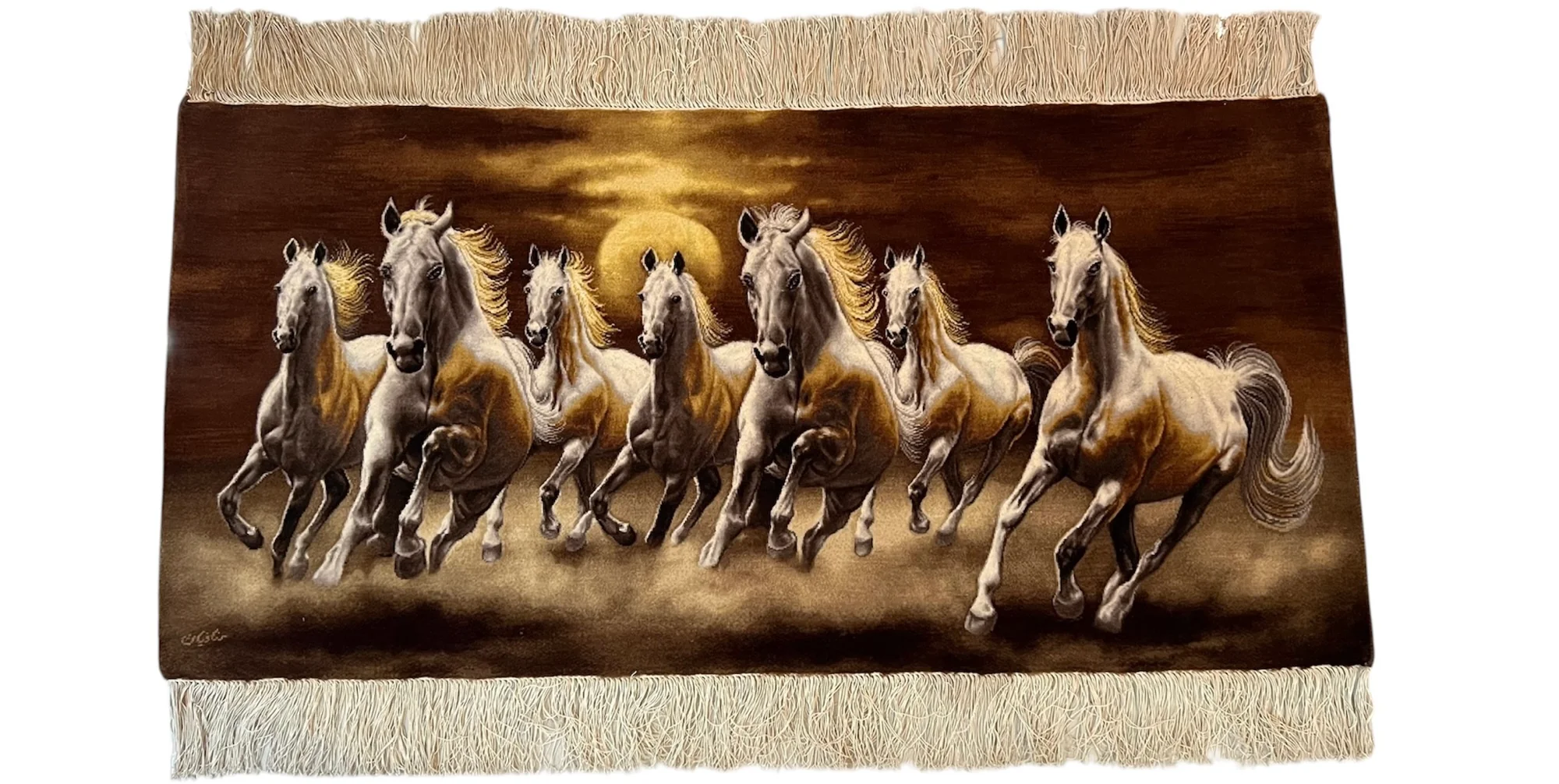 Hand-Knotted Persian Silk and Wool Wall Rug – Galloping Horses at Sunset 51” x 24″