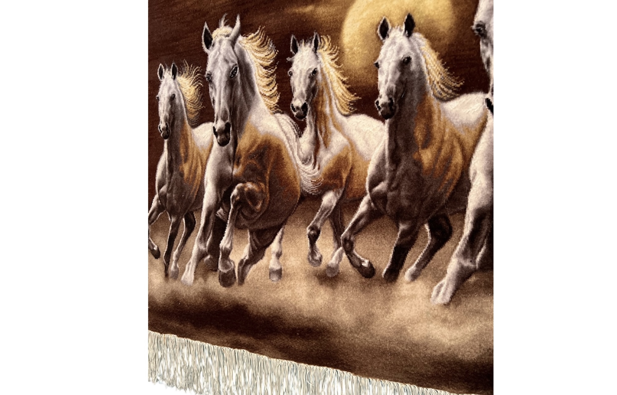 This Hand-Knotted Persian Silk and Wool Wall Rug showcases the dynamic and captivating scene of “Galloping Horses at Sunset.” The artistry conveys a sense of movement and freedom, with the horses depicted in exquisite detail against the warm, glowing hues of a sunset. The interplay of silk and wool threads creates a rich texture and a luminous effect, bringing the design to life with depth and vibrancy. Both durable and luxurious, this rug is more than a decorative piece—it’s a celebration of nature’s grace and beauty, perfect for adding warmth and energy to any space.