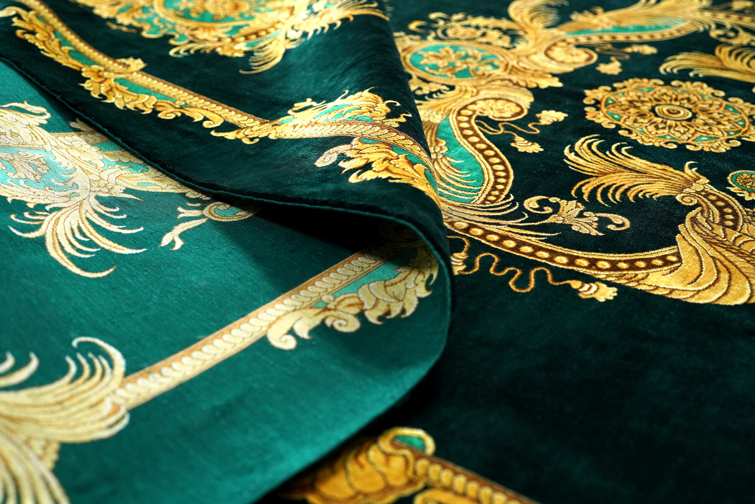 Named Khosrow’s Emerald Throne for its regal palette of hunter green, gold, and black — colors that once adorned the palaces of King Khosrow, symbolizing power, wealth, and timeless majesty. This one-of-a-kind Persian silk rug is a magnificent expression of heritage and artistry, handwoven by master Persian artisans with unmatched expertise. The design marries a deep hunter green field with golden arabesques and black accents, creating a palatial sense of depth and grandeur.